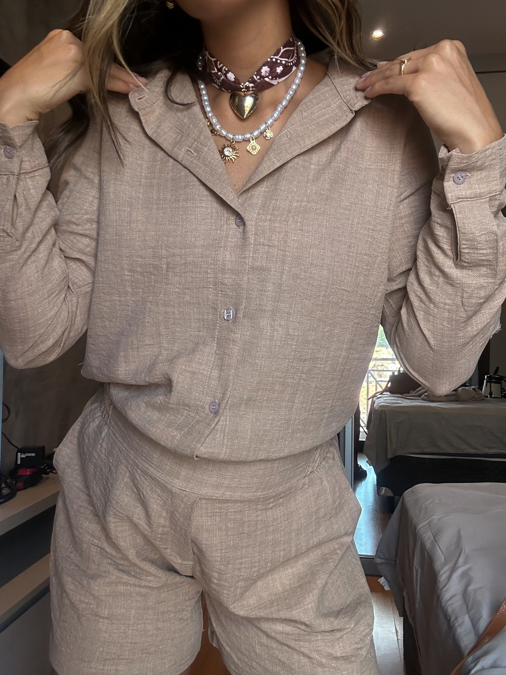 Este conjunto é a união perfeita de conforto e estilo, ideal para os dias mais quentes. Feito de um tecido leve e fluido, ele proporciona um caimento suave e uma sensação arejada, permitindo total liberdade de movimento. A camisa de manga longa tem um corte solto e relaxado, com um abotoamento frontal que pode ser usado aberto ou fechado, dependendo da sua preferência. O short possui uma cintura com elástico que garante um ajuste confortável e seguro, além de bolsos laterais práticos.