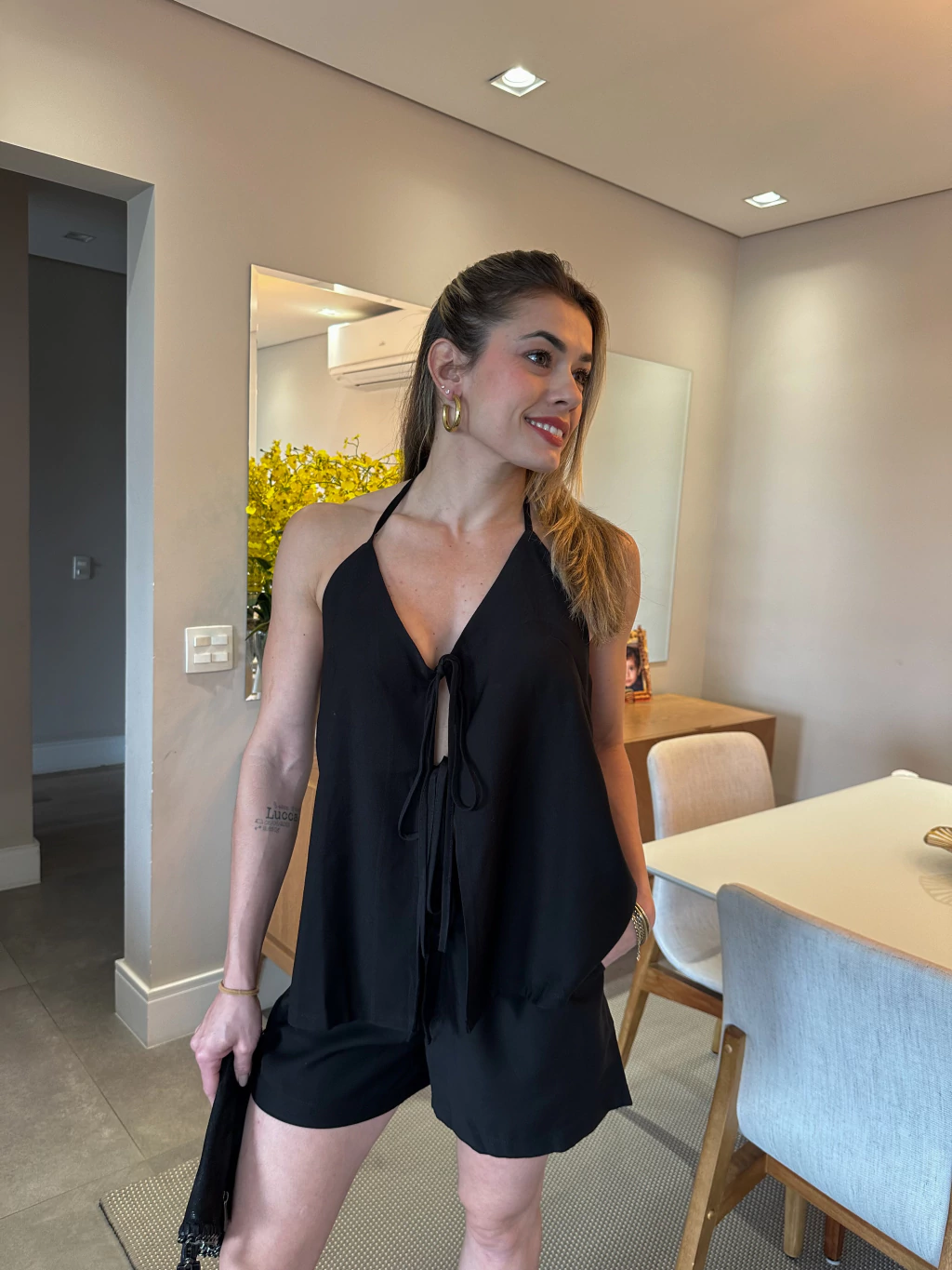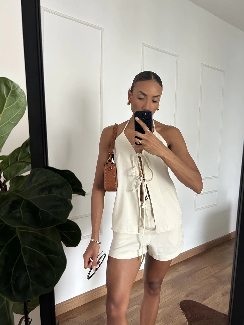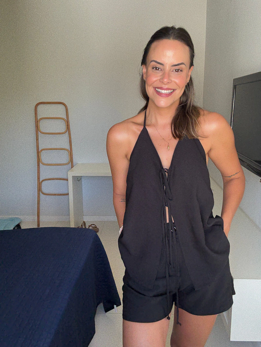 Blusa: Frente única com amarração frontal e traseira, proporcionando um ajuste personalizado e um toque moderno. Confeccionada em tecido marrant leve e confortável, ideal para os dias mais quentes. Short: Com cós alto e fechamento por botão, valoriza a cintura e oferece um caimento impecável. Detalhe de bolso faca que adiciona um toque de estilo.