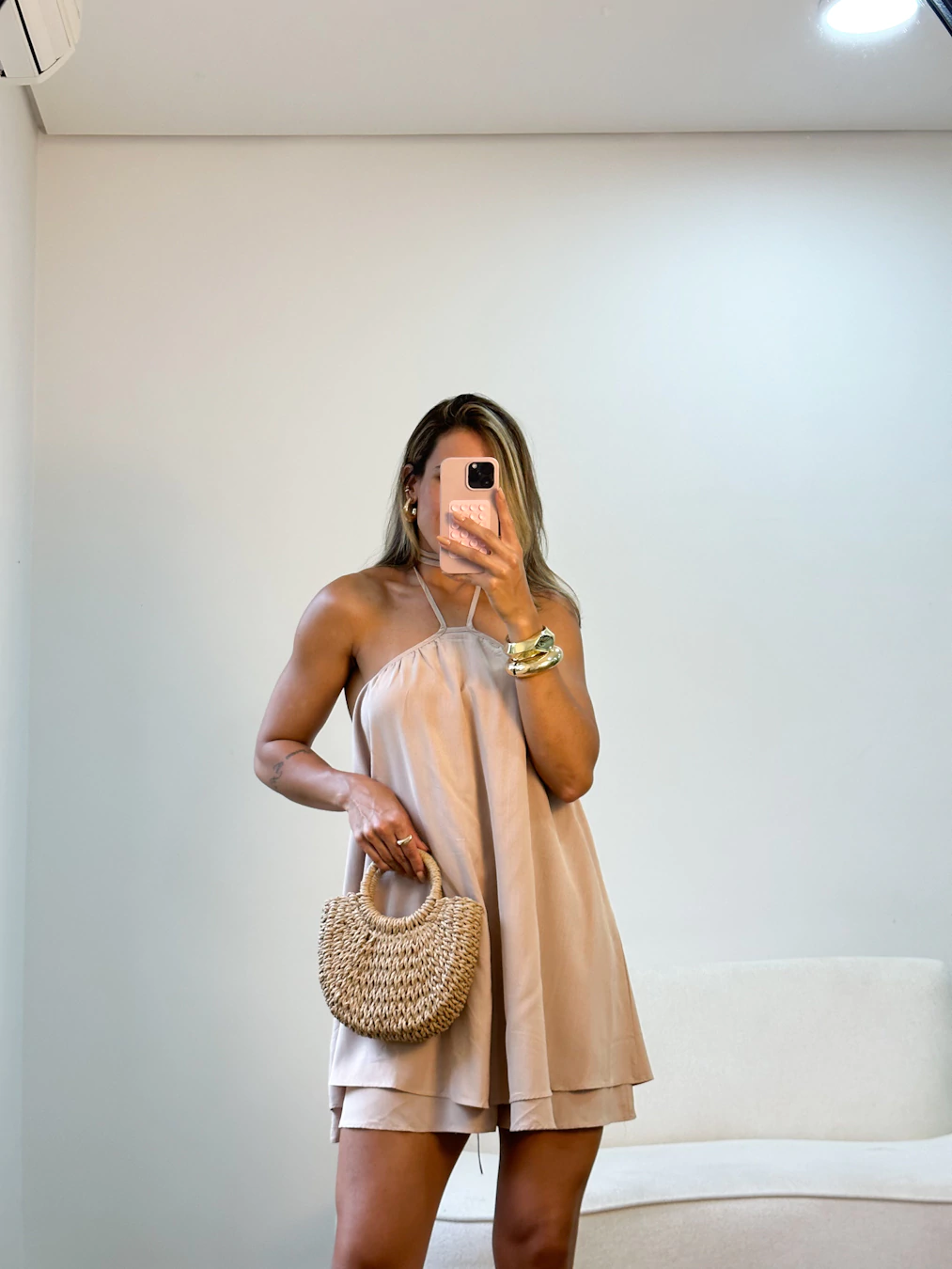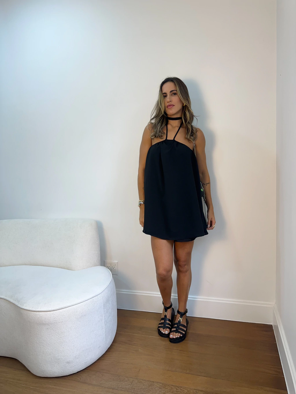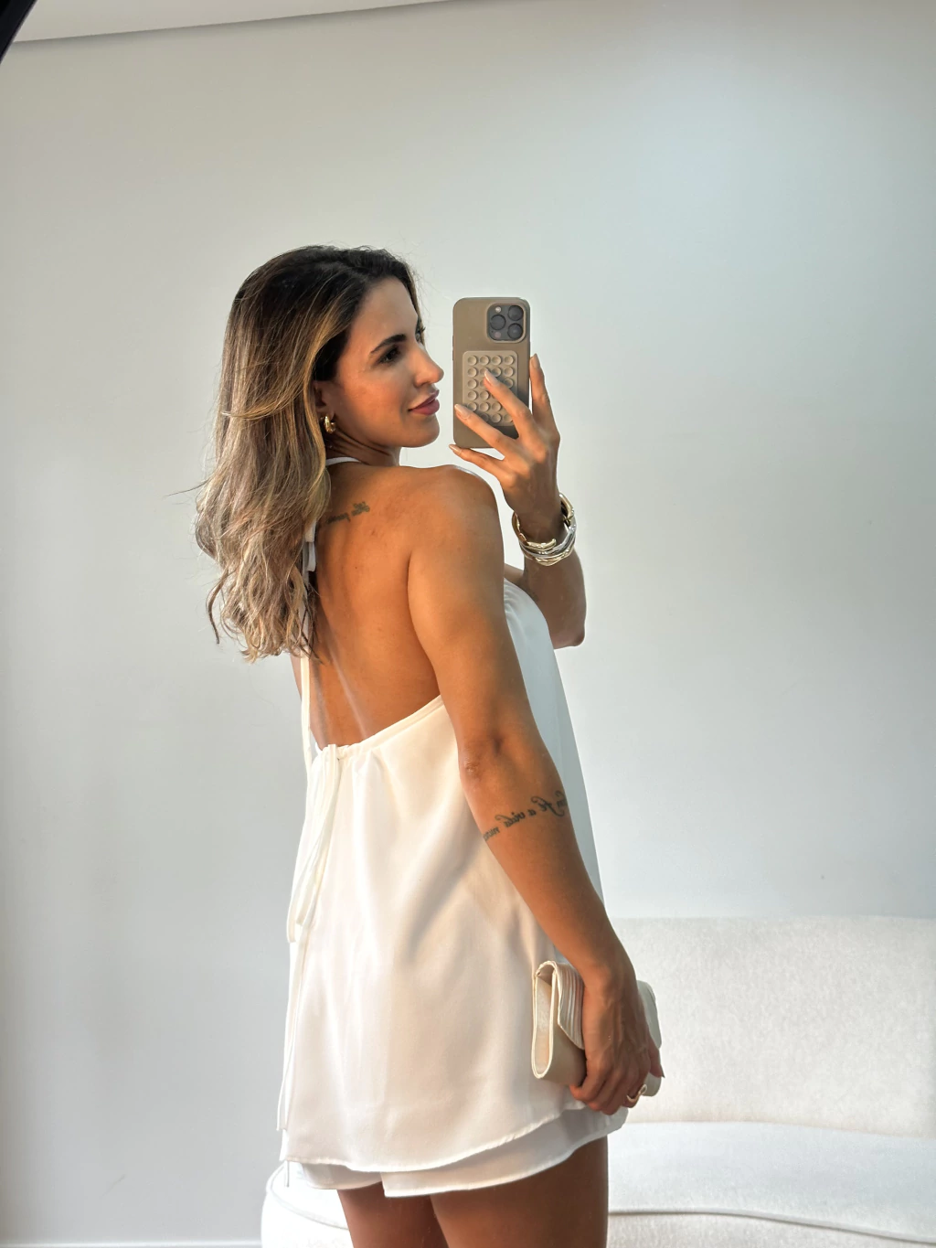 Possui silhueta com caimento leve e fluido, possui um charmoso detalhe de amarração no pescoço e nas costas, possui short por baixo.