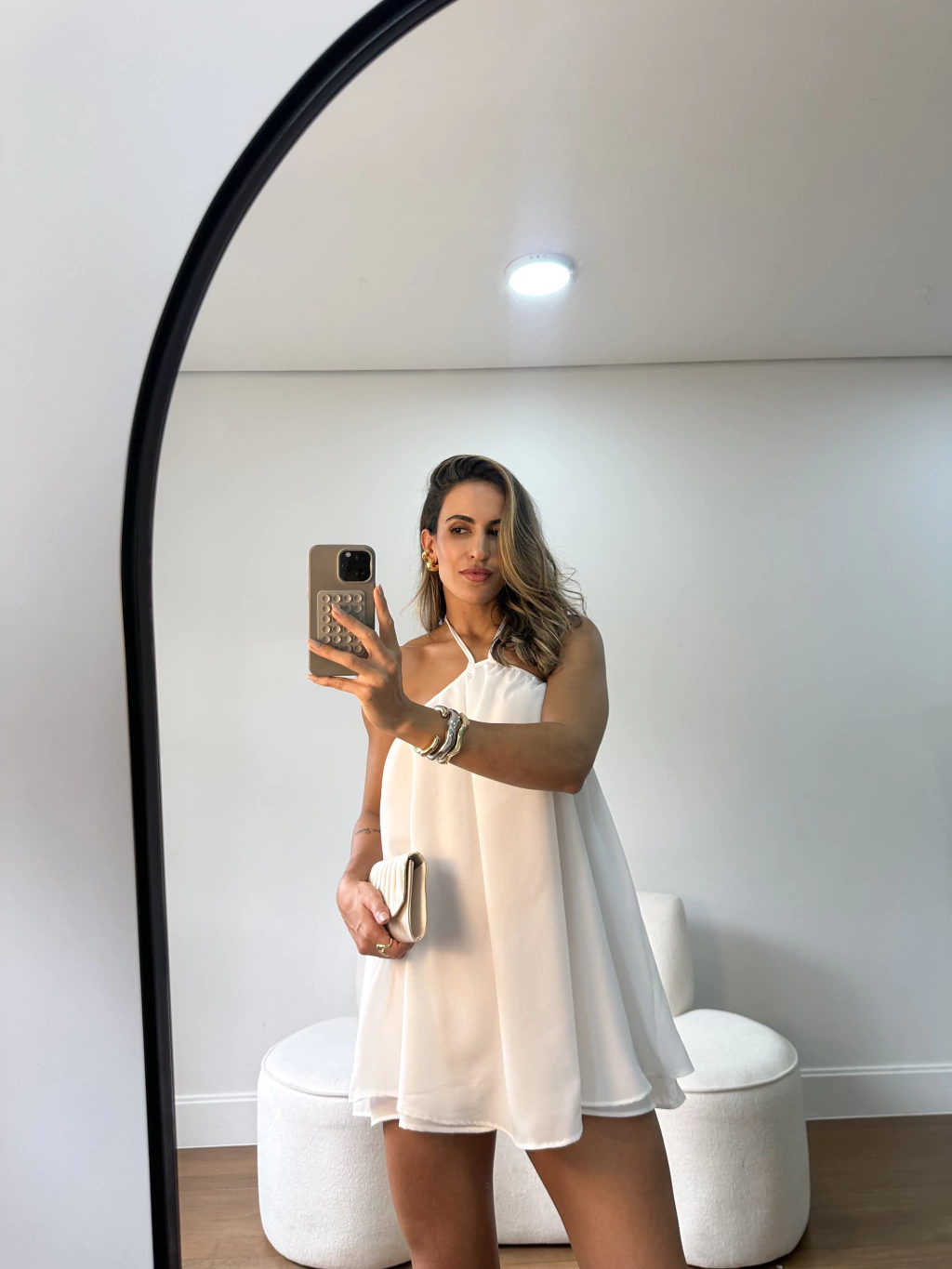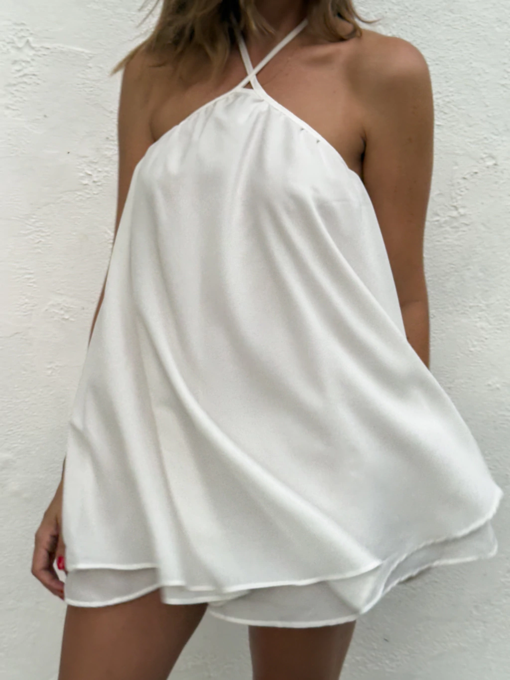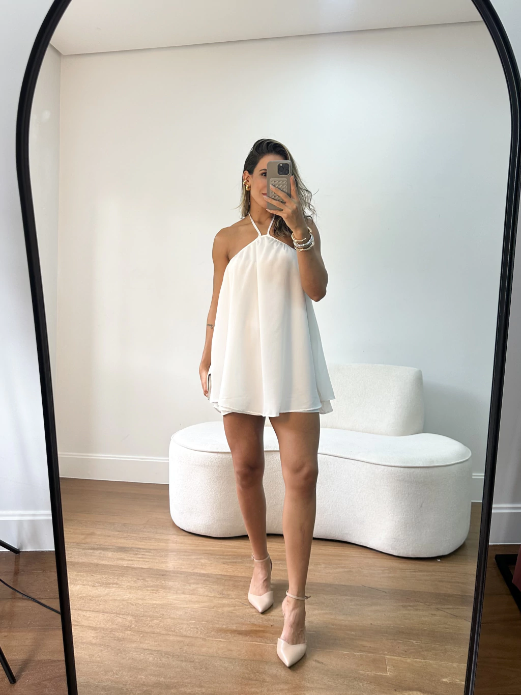 Possui silhueta com caimento leve e fluido, possui um charmoso detalhe de amarração no pescoço e nas costas, possui short por baixo.